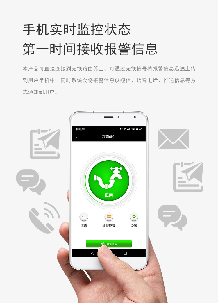 Product Description:本款WIFI型无线漏水探测报警器,防水等级达到IP67,可在5米深水下正常工作。采用家用无线网络传输方式,触控操作,可充电,可远程发送报警数据到手机APP,报警信息到手机,语音报警灯功能